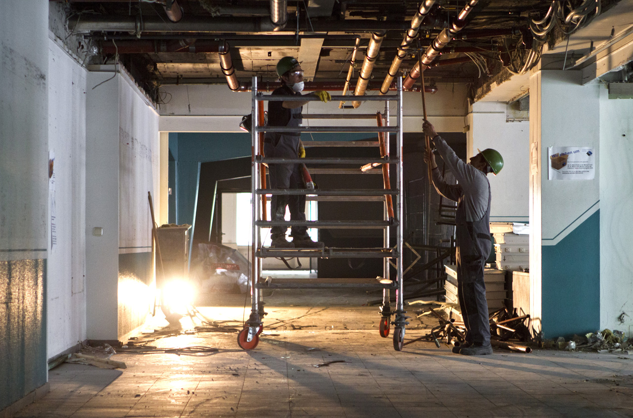 Anfang April treffen die ersten Bauarbeiter ein, um die verschiedenen Gebäudetrakte zu entkernen. Der Abriss vieler aus statischen Gründen nicht notwendiger Wände und die Entfernung der alten Verkleidungen, Bodenbeläge, Abhangdecken sowie Leitungen und Installationen erzeugt große Mengen an Bauschutt. Über Monate hinweg wird täglich eine Fülle von Materialien nach Fraktionen getrennt, aus dem Gebäude gebracht und anschließend fachmännisch entsorgt. Bereits im Vorfeld der Baumaßnahme sind durch einen Gutachter Materialproben genommen worden, um die eventuelle Existenz von Schadstoffen früh zu erkennen beziehungsweise deren Fundorte zu lokalisieren.