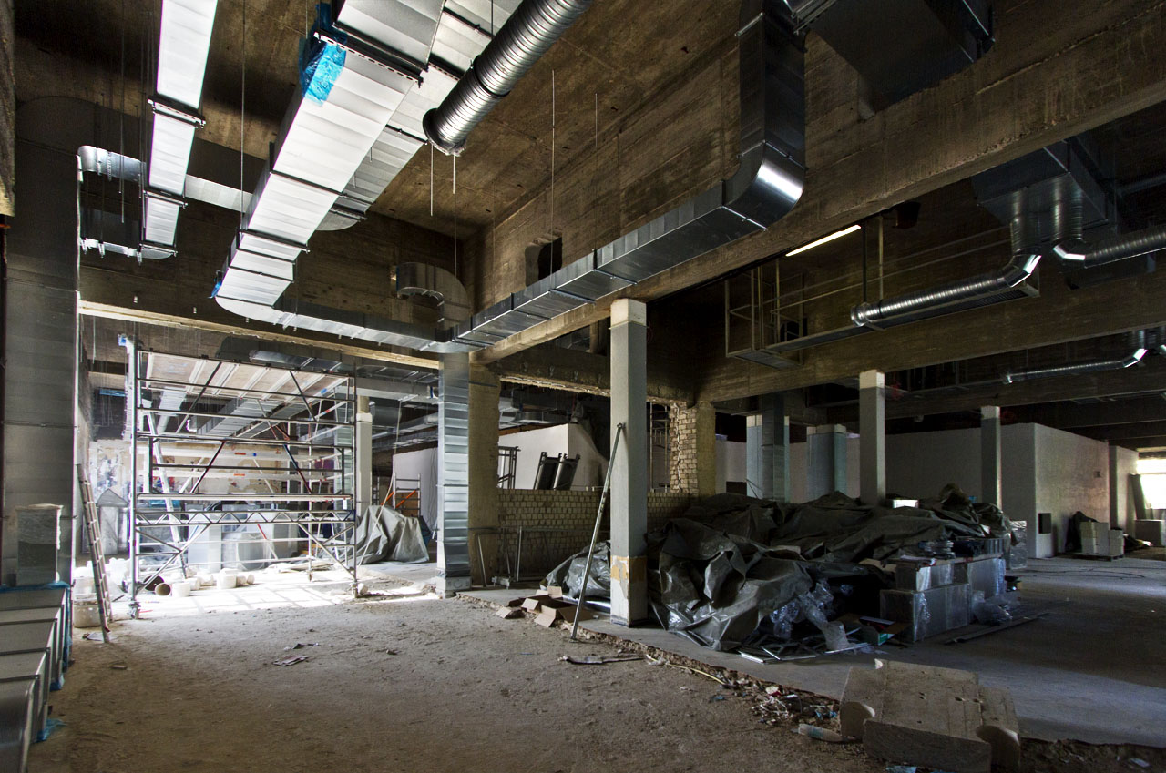 Parallel zu den Abbrucharbeiten, die noch bis Ende 2012 dauern, nimmt im August die Rohbaufirma ihre Arbeit auf. In den bereits entkernten Gebäudeteilen werden die ersten Wände gemauert, und im Zuge von Stahlbetonarbeiten entstehen neue Treppen, Decken und Aufzugsschächte. Im Bereich der Anlieferung wird die alte Rampenanlage abgerissen und die Fundamente für den neuen Küchenanbau hergestellt. Im Außenbereich werden Gräben für neue Kanäle gezogen und feuchte Kellerwände trockengelegt.